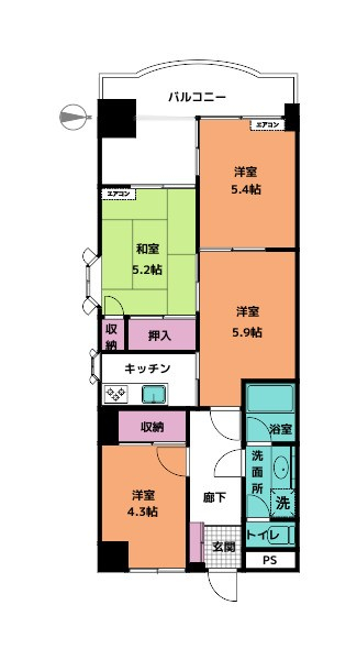 | 間取り | 4K | 間取り詳細 | 洋室5.9・洋室5.4・洋室4.3・和室5.2 | 専有面積 | 57.28㎡ |