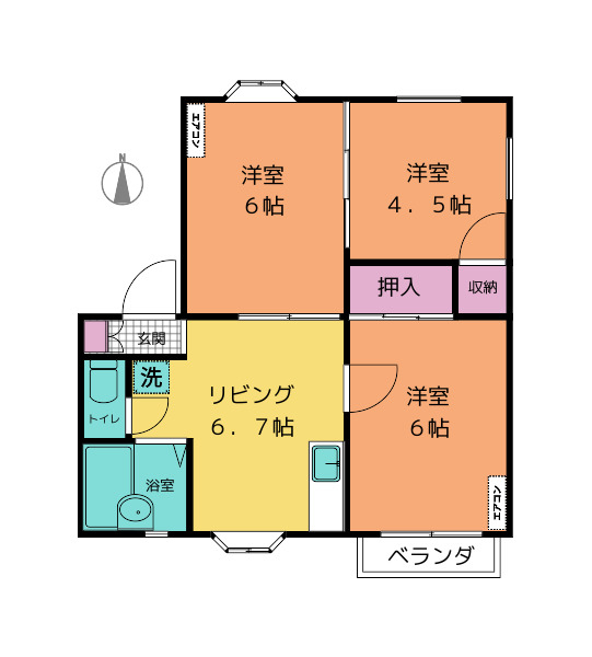 | 間取り | 3DK | 間取り詳細 | 洋室室6帖・洋室6帖・洋室4.5帖・DK6.7帖 | 専有面積 | 46㎡ |