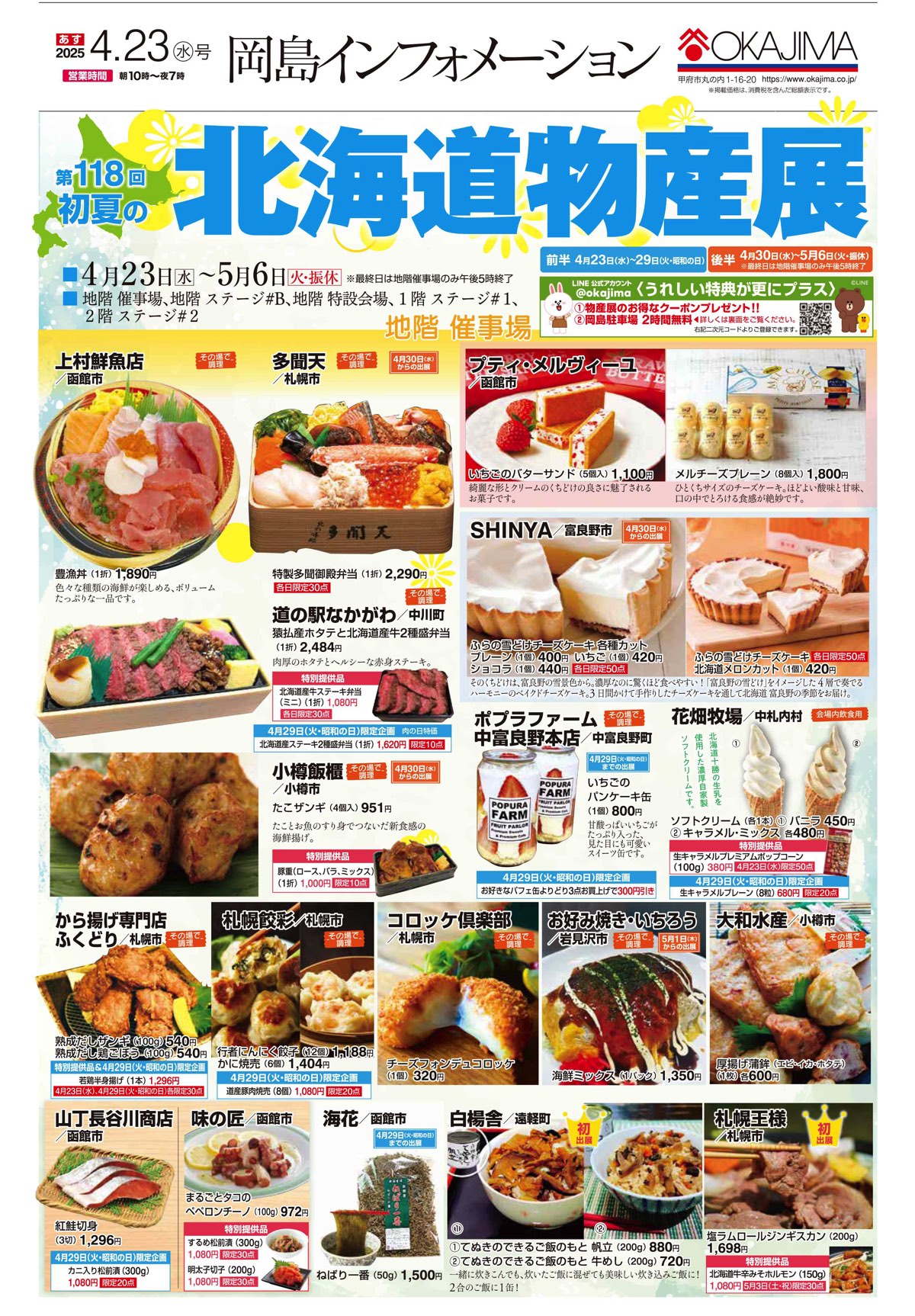 北の大地の味覚が大集合!! 毎回大人気の「北海道物産展」が岡島の各階プロモーションスペースを全て使って開催! 北海道の人気スイーツをはじめ、新鮮な海鮮やお肉を使った弁当にお惣菜!!...
